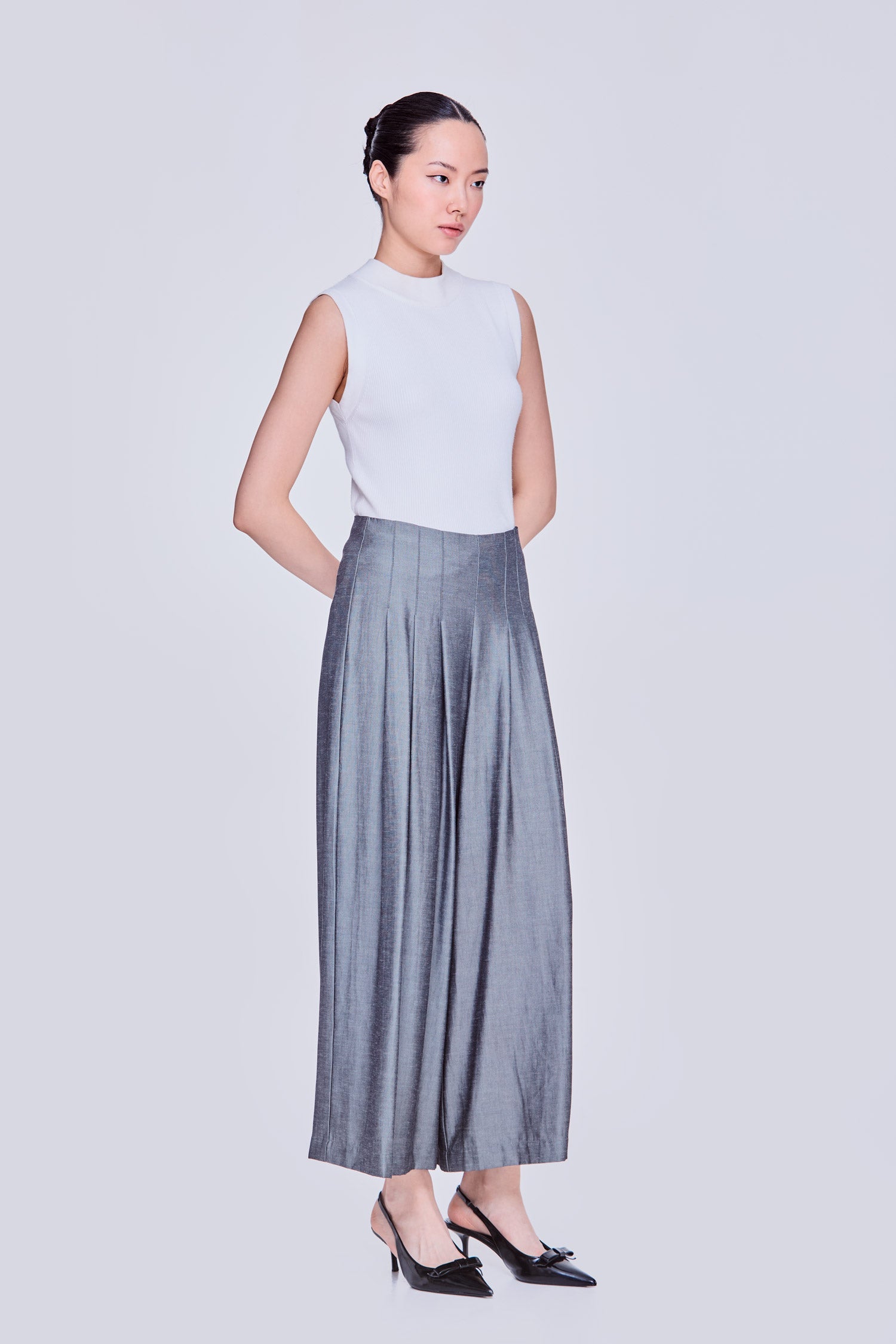 Wide leg cut with flattering darts details